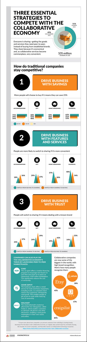下面列出的信息圖表總結(jié)了傳統(tǒng)品牌在價(jià)格、便捷性和品牌這三個(gè)方面應(yīng)如何考慮以與分享型經(jīng)濟(jì)競爭。