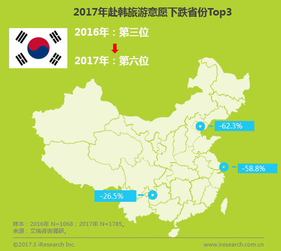 赴韓中國(guó)游客自2010年以來(lái)逐年增加,2016年首次超過(guò)800萬(wàn)人次,占赴韓外國(guó)游客的比例將近一半,同比增加34.4%(韓國(guó)文化體育觀光部數(shù)據(jù)統(tǒng)計(jì))。但根據(jù)艾瑞最新的調(diào)研數(shù)據(jù)顯示,2017年游客出境游(含港澳臺(tái))熱門目的地Top3分別是泰國(guó)、日本和香港,韓國(guó)跌至第六位,計(jì)劃赴韓人數(shù)同比2016年下跌30%,尤其是上海地區(qū)民眾赴韓意愿減弱,同比減少62.3%,其次是天津和重慶下跌明顯。
