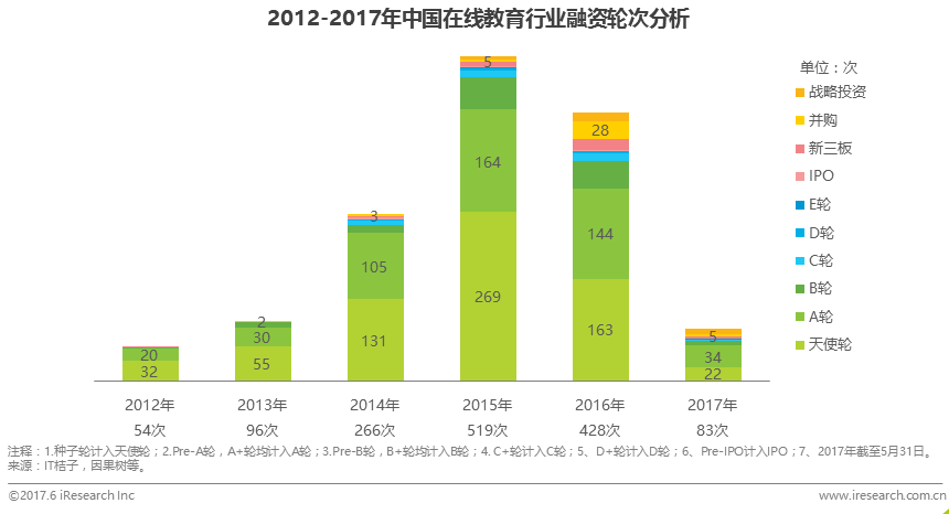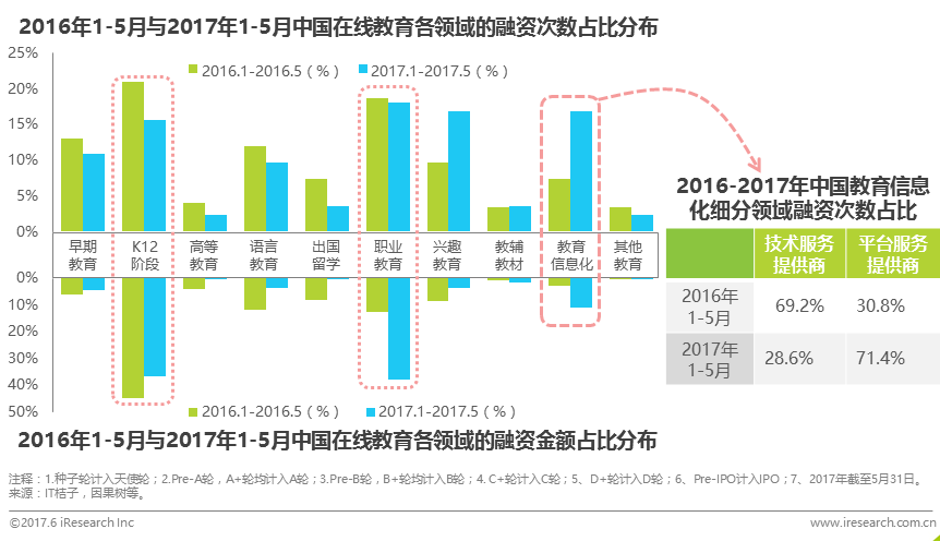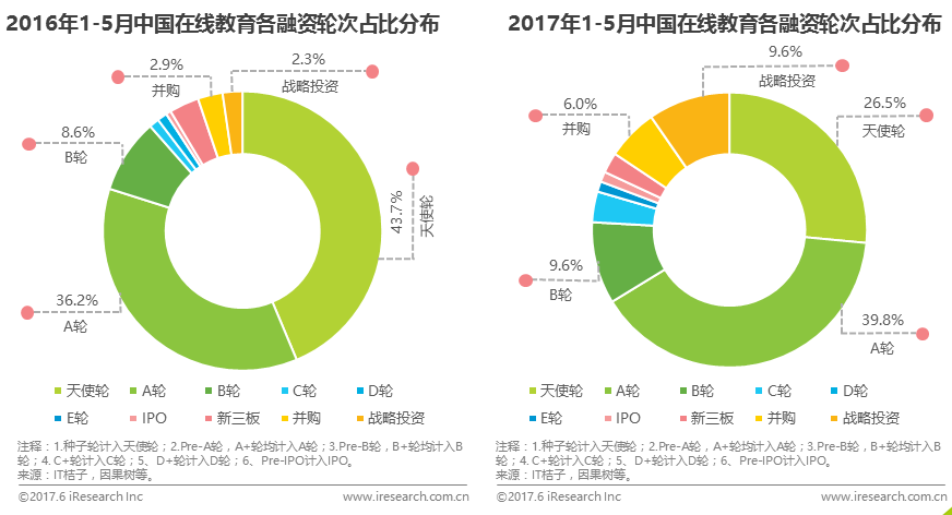 2017年較2016年同期出現(xiàn)大幅增長的是并購和戰(zhàn)略投資次數(shù),其占比分別由原來的2.9%和2.3%增長為6.0%和9.6%,這表明行業(yè)內(nèi)并購頻次增加,諸多在線教育領頭企業(yè)開始通過并購的方式擴大自己的產(chǎn)品線或業(yè)務范圍。同時,企業(yè)間的戰(zhàn)略投資增加,行業(yè)上下游或行業(yè)內(nèi)企業(yè)間合作共贏局面開始雛形。