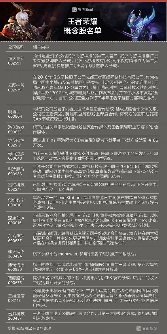 對此,一名證券業(yè)人士也對界面新聞?dòng)浾叻治龇Q,名單中的“《王者榮耀》概念股”,基本上和《王者榮耀》游戲本身沒有太強(qiáng)的聯(lián)系,更多的只是外界的炒作。