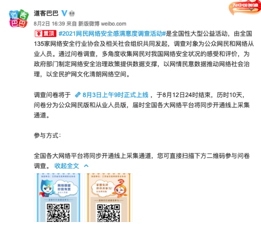 在公司黨支部的指導(dǎo)下,內(nèi)容運(yùn)營部門充分利用微博、頭條等公眾平臺(tái),轉(zhuǎn)發(fā)活動(dòng)公告,引導(dǎo)更多網(wǎng)民關(guān)注本次調(diào)查活動(dòng)。8月3日北京網(wǎng)絡(luò)安全協(xié)會(huì)官方網(wǎng)站發(fā)布問卷鏈接后,公司緊跟調(diào)查活動(dòng)開展進(jìn)度,通過發(fā)布問卷二維碼鏈接,助力采集更多有效問卷。3日至12日調(diào)查活動(dòng)開展期間,在公司黨支部的統(tǒng)籌領(lǐng)導(dǎo)下,公司各部門加強(qiáng)協(xié)作配合,充分發(fā)揮互聯(lián)網(wǎng)平臺(tái)信息傳播優(yōu)勢,及時(shí)更新調(diào)研活動(dòng)信息,鼓勵(lì)用戶參與到調(diào)查活動(dòng)中。在公司內(nèi)部,黨支部通過組織開展員工問卷填寫活動(dòng),助力公司進(jìn)一步明確網(wǎng)絡(luò)安全的內(nèi)容與要求,并安排相應(yīng)的業(yè)務(wù)培訓(xùn),強(qiáng)化員工網(wǎng)絡(luò)安全意識(shí),加強(qiáng)對(duì)用戶權(quán)益的保護(hù),全面提升公司整體網(wǎng)絡(luò)安全管理及業(yè)務(wù)水平。