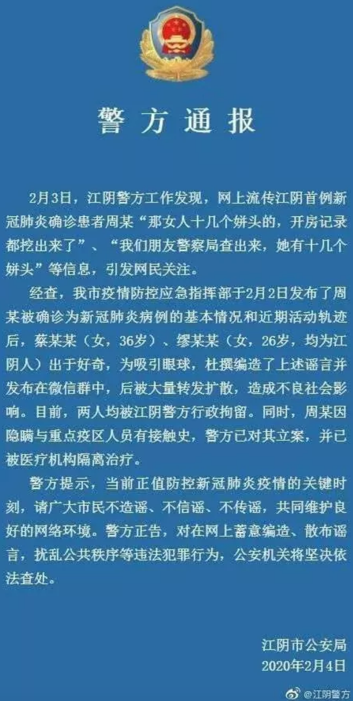 2月3日,江陰警方工作發(fā)現(xiàn),網(wǎng)上流傳江陰首例新冠肺炎確診患者周某“那女人十幾個姘頭的,開房記錄都挖出來了”、“我們朋友警察局查出來, 她有十幾個姘頭”等信息,引發(fā)網(wǎng)民關(guān)注。